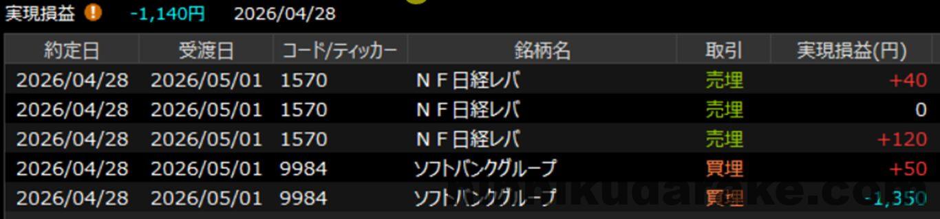 デイトレ 2026/4/28 イナゴ失敗 2026.04.28投稿 デイトレ この記事にはアフィリエイト等の広告が含まれます 始値: 60,531.78円 高値: 60,634.66円 終値: 59,917.46円 前日比-619.90円でした 日経寄与度上位5銘柄 参照:株探 9983 ファストリ 4519 中外薬 9433 KDDI 4063 信越化学 285A キオクシア この記事の目次 日経寄与度上位5銘柄 取引銘柄 デイトレ スイング 結果 振り返り 取引銘柄 デイトレ 前場 1570 NF日経レバ 後場 9984 ソフトバンクグループ スイング 結果 振り返り イナゴしてみようとして失敗イナゴするのにも躊躇イナゴさえできない